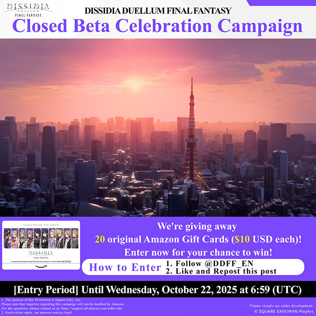 To commemorate the launch of the Closed Beta Test on Nov. 6, the company will host a raffle on the DISSIDIA DUELLUM FINAL FANTASY official social media accounts. Follow the official DISSIDIA DUELLUM FINAL FANTASY X/Twitter (@DDFF_EN) or Facebook account and repost the Closed Beta Test post by the entry deadline. Twenty winners will be selected at random to receive an Amazon Gift Card in celebration of the upcoming Closed Beta Test.