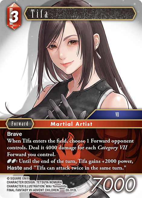 Tifa's auto-ability inflicts 4000 damage for each Category VII Forward in play. Since Tifa [28-013L] herself counts, you'll deal at least 4000 damage when she enters the field. If two other cards in play qualify, you can do 12000 damage, which is enough to fell most Forwards. There are a lot of ways to fulfill these conditions, so it's a pretty strong card.